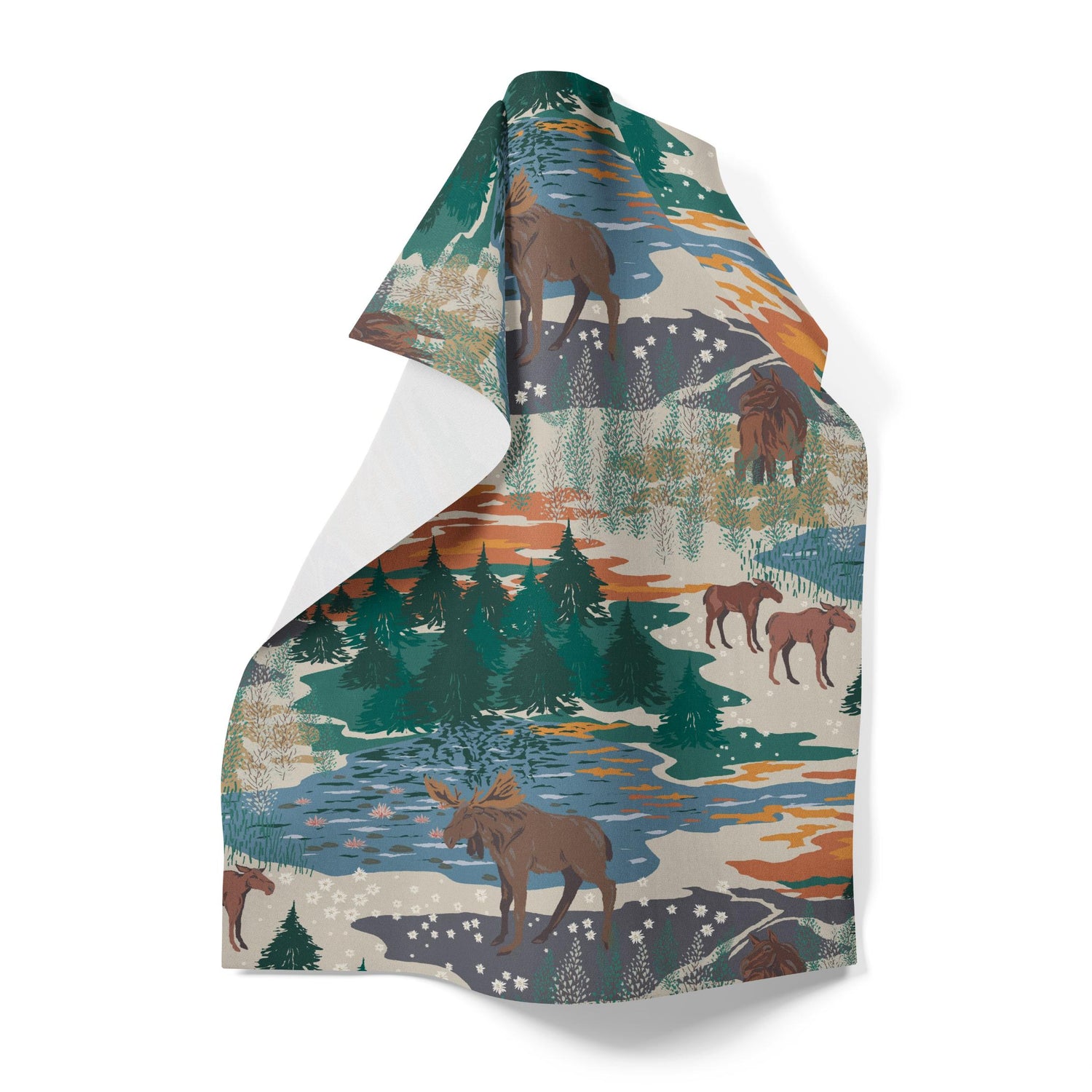 En kökshandduk som fångar känslan av den nordiska skogen. I motivet vandrar älgar stilla genom landskapet, bland spegelblanka sjöar, granar och mjuka naturtoner – en liten påminnelse om lugnet som finns där ute.